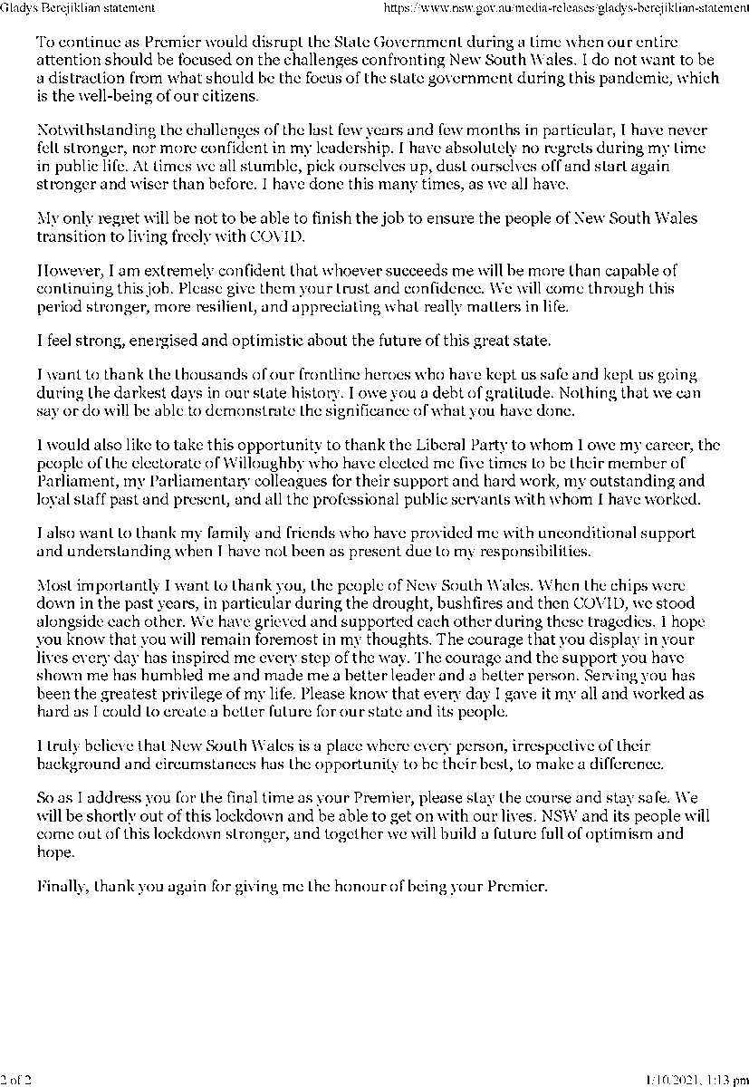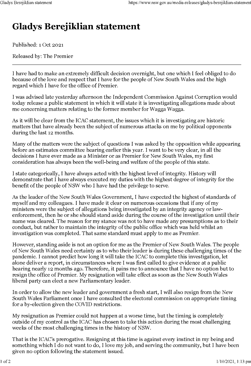 But from Monday the daily briefings are going to look a little different. 1 day agoGladys Berejiklian has resigned as New South Wales Premier amid a probe by the states anti-corruption watchdog. Gladys Berejiklians statement announcing she would resign as NSW Premier and also leave Parliament.